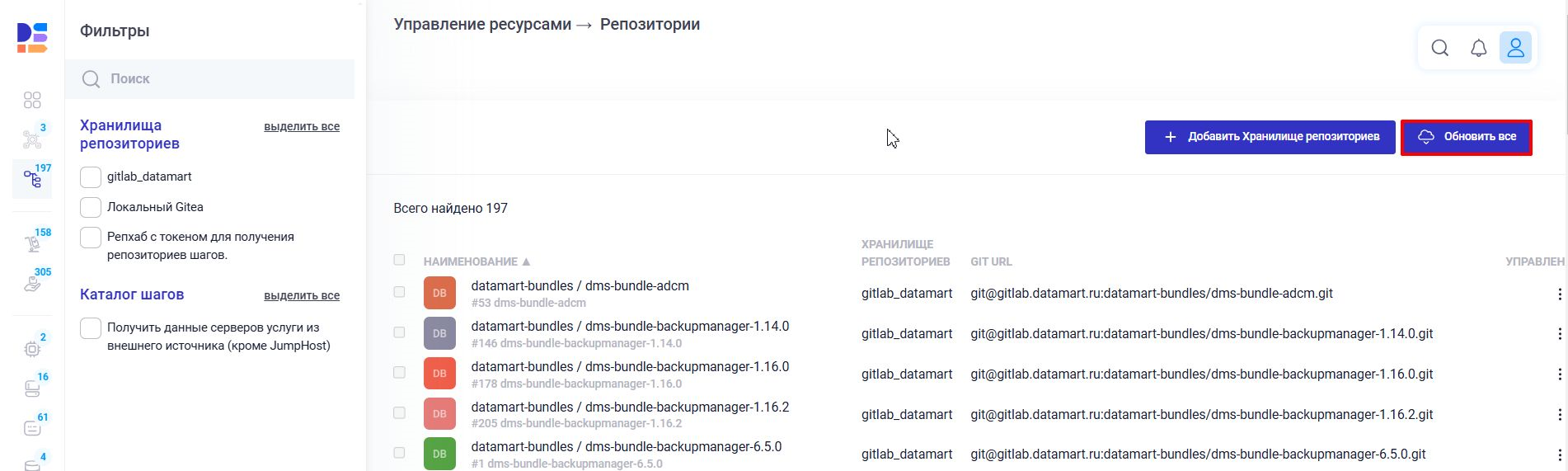 После успешного обновления контейнеров, необходимо запустить процедуру обновления бандлов из хранилищ(а) репозиториев. Для этого в разделе «Хранилища репозиториев» необходимо нажать на кнопку «Обновить» для каждого из хранилищ.