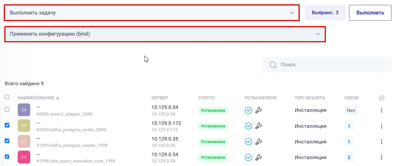 Например, удобно выбрать все инсталляции для которых произошла смена конфигурации и требуется действие Применить конфигурацию (bind):