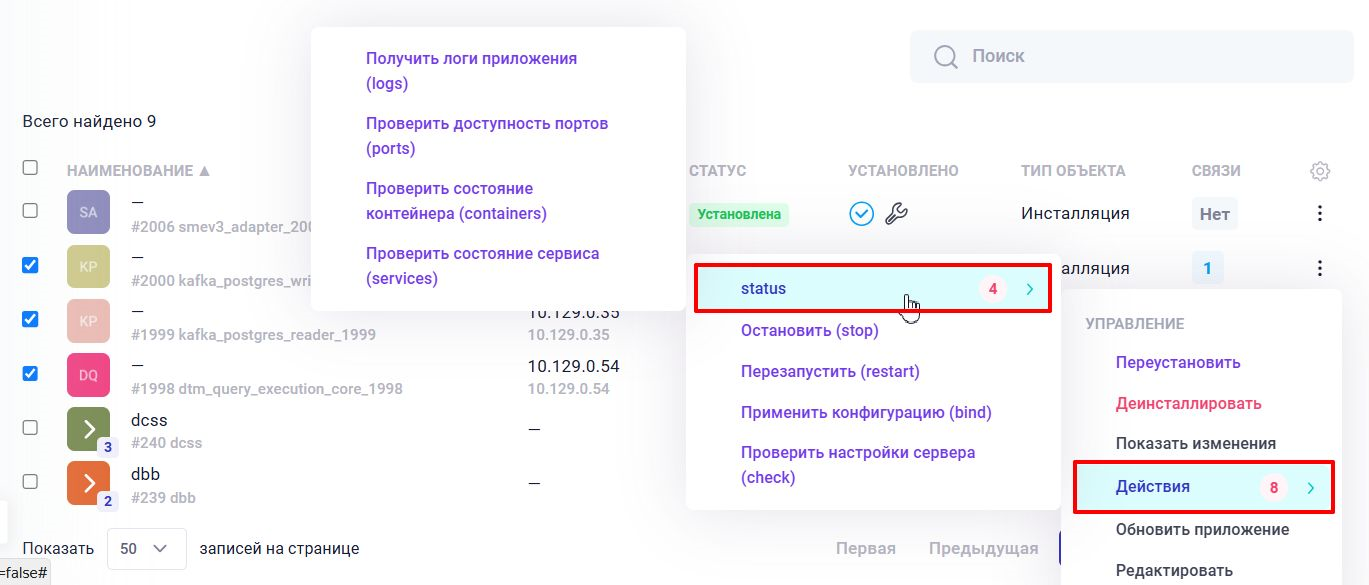 При нажатии на кнопку «Управление» в разделе «Действия» расположена вложенная папка «Status». В эту папку в каждом бандле собраны действия оперативного мониторинга инсталляций — проверки текущего статуса запущенного приложения в услуге.