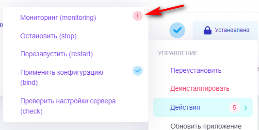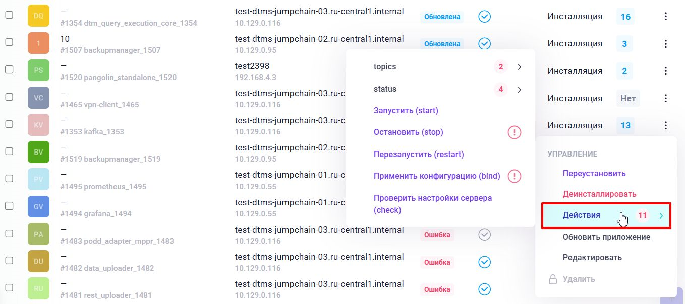 При нажатии на кнопку «Управление» в меню «Действия» указаны дополнительные действия, которые можно выполнить с инсталляциями. Набор действий для каждого из приложений определяется в бандлах и может отличаться от приложения к приложению, в зависимости от того, как запрограммировано взаимодействие с данным приложением в бандле.