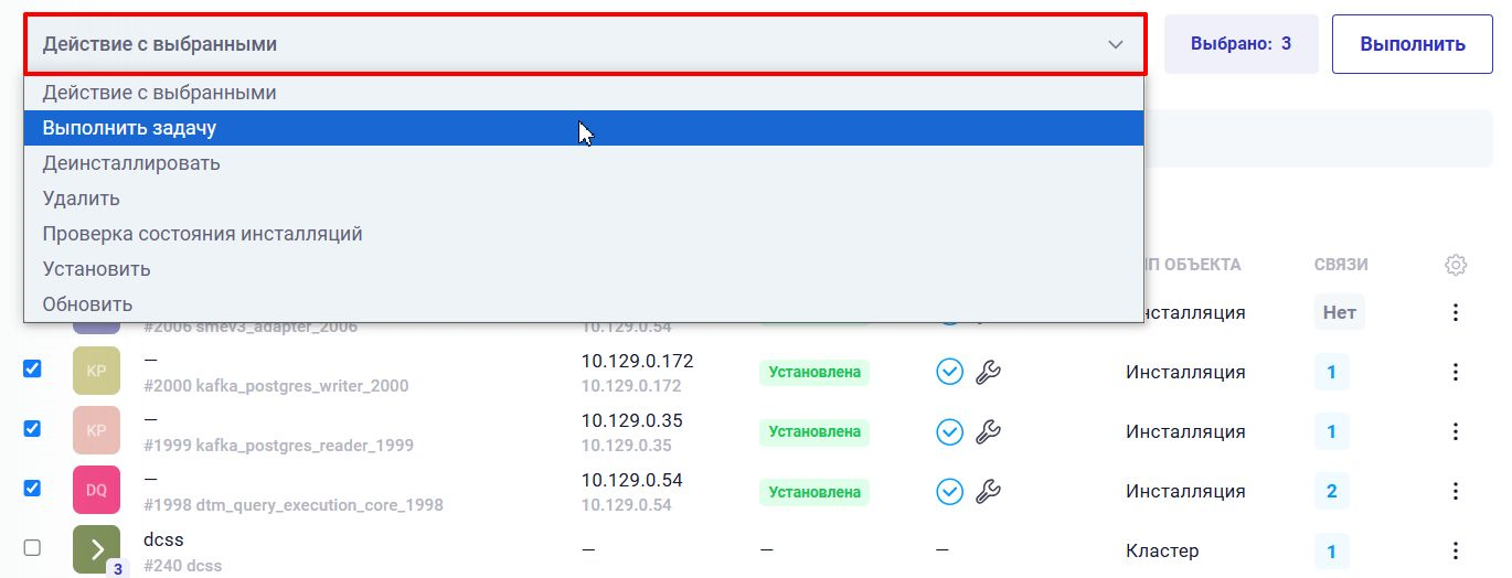 В выпадающем меню есть опция «Выполнить задачу», которая позволяет из доступного списка действий выбрать необходимое и применить сразу для группы инсталляций.