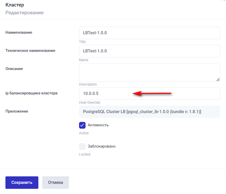 Для кластера PostgreSQL Cluster LB параметр KEEPALIVED_VIRTUAL_IP указывается в настройках кластера в поле **ip балансировщика кластера** , как показано на рисунке: