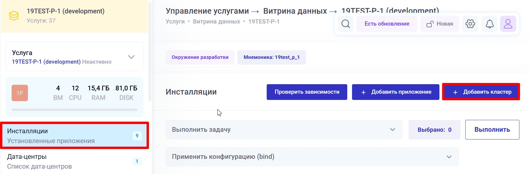 В списке приложений, для которых можно создать кластер будут доступны только те приложения, инсталляции которых уже добавлены в услугу.