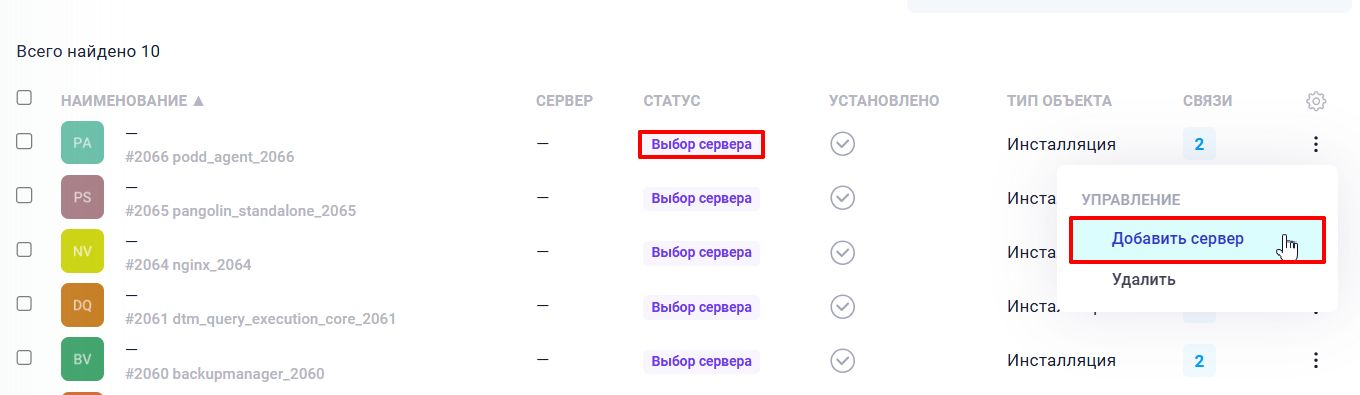Назначить инсталляции определенный сервер можно выбрав действие «Добавить сервер» в меню управления инсталляцией или при нажатии на no_server в списке инсталляций (см. Рисунок 15.5).