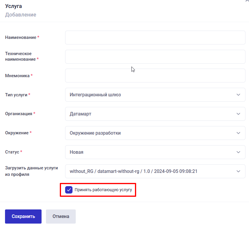 При переносе услуги из другого экземпляра Datamart Platform Studio необходимо активировать чек-бокс «Принять работающую услугу». Процесс переноса услуги описан в Раздел 15.2.3 Перенос услуги.