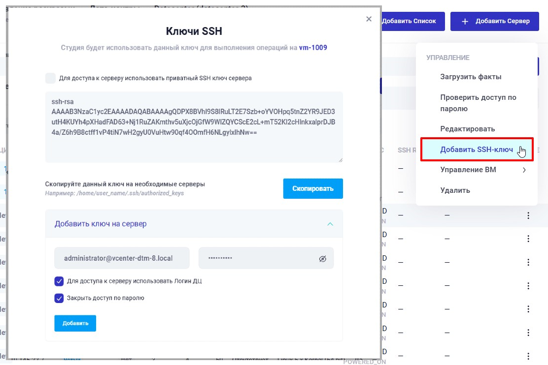 Для добавления ключа на сервер нужно нажать на кнопку «Управление», затем выбрать действие Добавить ssh-ключ (см: Рисунок 3.20). По умолчанию используется логин и пароль из настроек ДЦ.