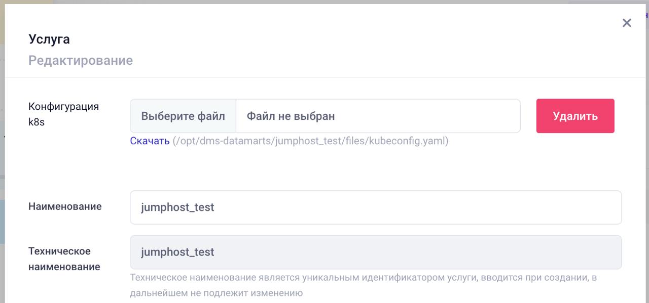 Для подключения услуги к среде K8s в настройках услуги необходимо добавить конфигурационный файл, предоставленный администратором K8s: