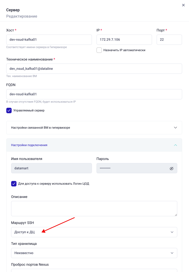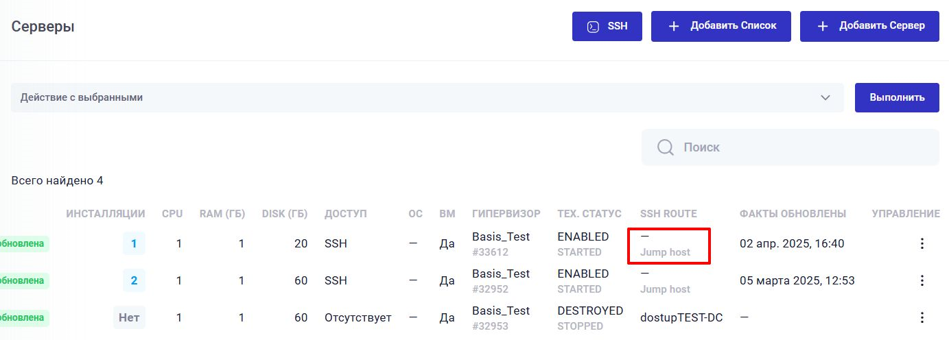 Если для доступа к серверу настроен маршрут или сервер задействован, как JumpHost в одном из маршрутов, то эта информация отображается в колонке Маршрут SSH в списке серверов ДЦ: