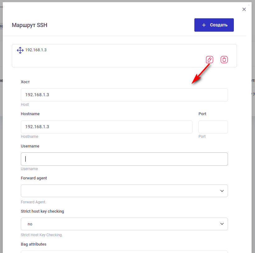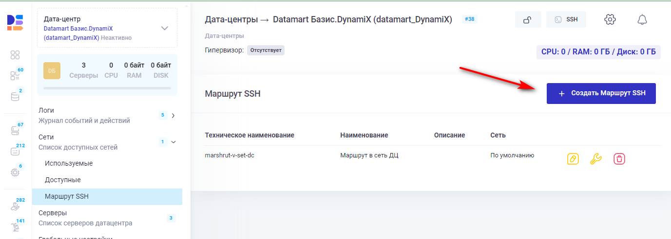 В карточке ДЦ в разделе «Сети» добавить новый SSH маршрут;