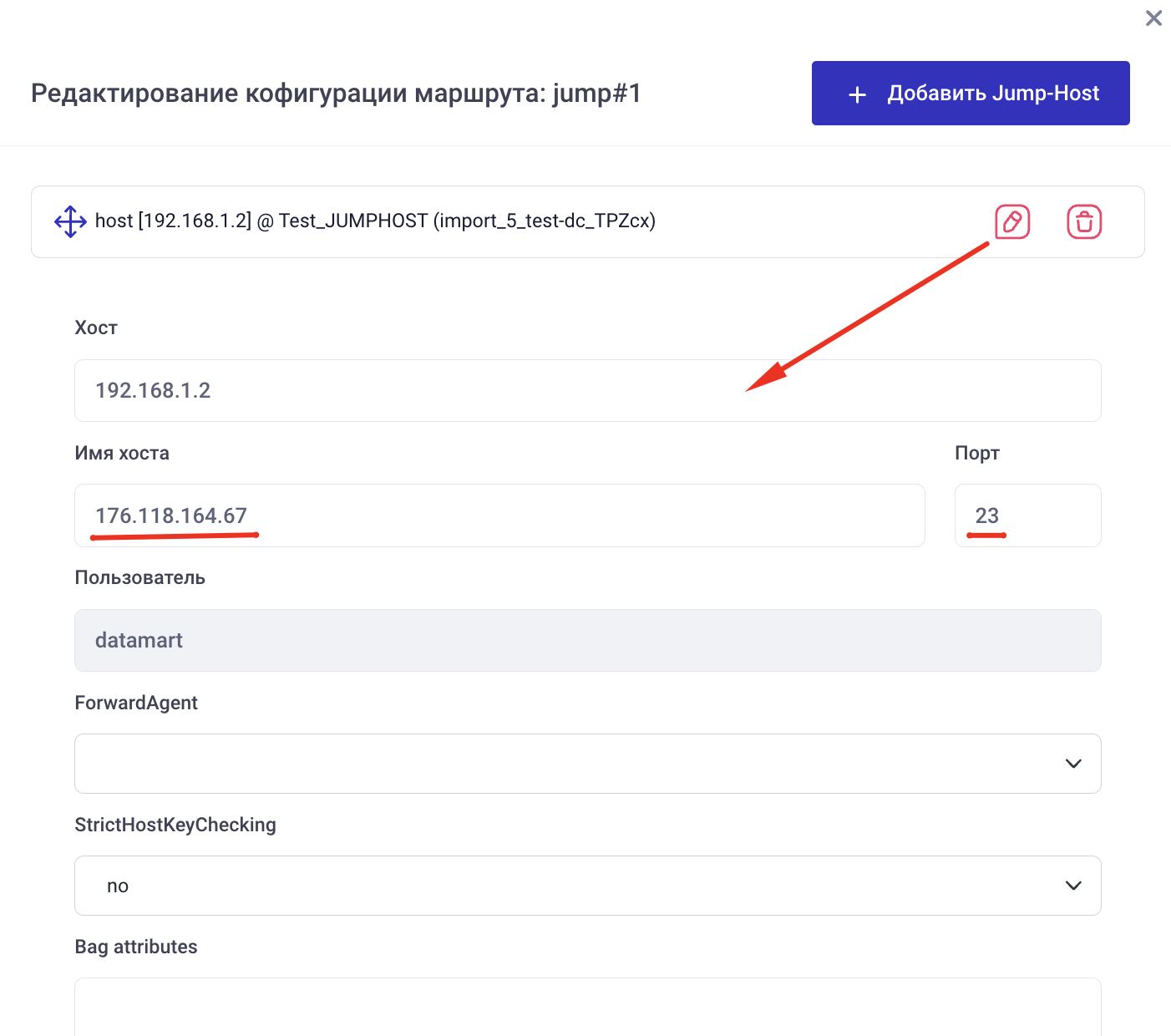 В конфигурации маршрута указать цепочку серверов (в самом простом случае, это будет один сервер выполняющий функцию JumpHost-шлюза в сеть ДЦ). Добавление JumpHost-шлюза в маршрут производится нажатием кнопки «Добавить JumpHost»;